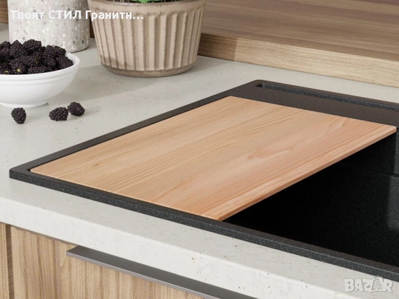 Включени аксесоари – дъска за рязане, отцедник и възможност за комбинация със смесител и дозатор в същия стил.