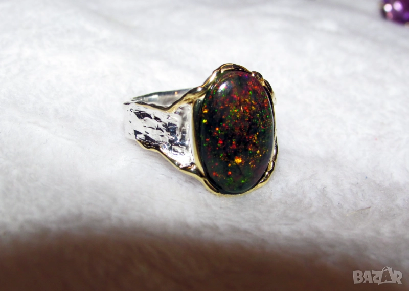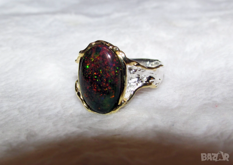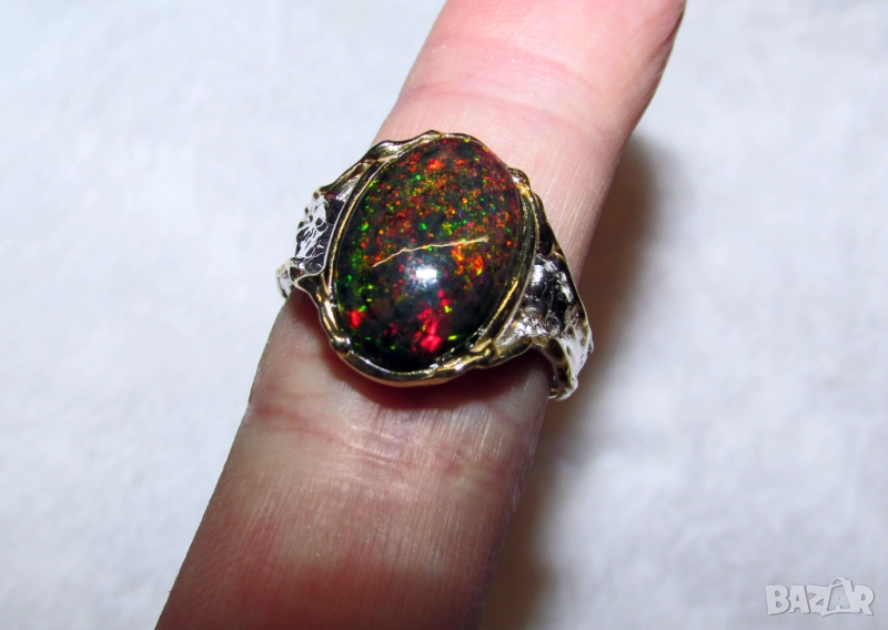 опал камък 16x11мм. Тегло на пръстена 5.6гр. Произход Етиопия. Златно покритие - бяло. Халка 8/57/18.19. Цена 320лв.