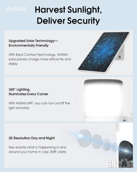 ANRAN 2K безжична соларна охранителна камера с прожектор, PIR детектор