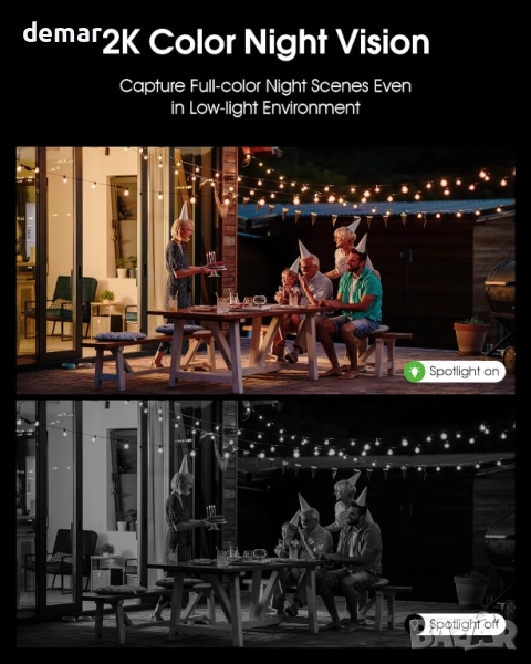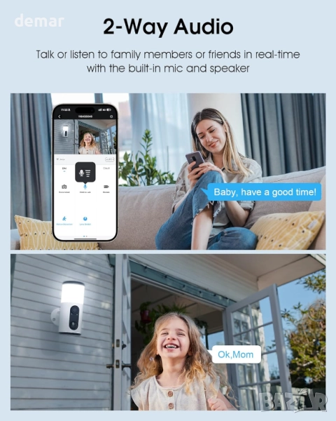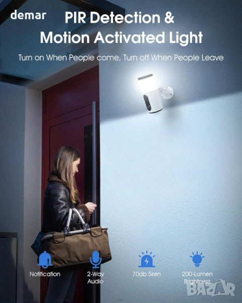 Тази стенна камера съчетава сигурност и осветление с 200-луменов прожектор, който се активира при засичане на движение, осигурявайки ясни 2K изображения и ярки цветове за нощно виждане дори в пълен мрак. Нейният интелигентен PIR сензор открива движение до 12 метра, намалявайки фалшивите аларми, а приложението позволява двупосочно аудио, дистанционно управление и 70 dB сирена за допълнително възпиране. Подобреният соларен панел осигурява ефективно зареждане, захранвайки камерата само с няколко часа слънчева светлина и осигурявайки надеждна работа чрез вградената ѝ батерия. Лесна за инсталиране с Wi-Fi свързаност, тя предлага безпроблемно взаимодействие за посрещане на посетители или възпиране на натрапници директно от вашия смартфон.