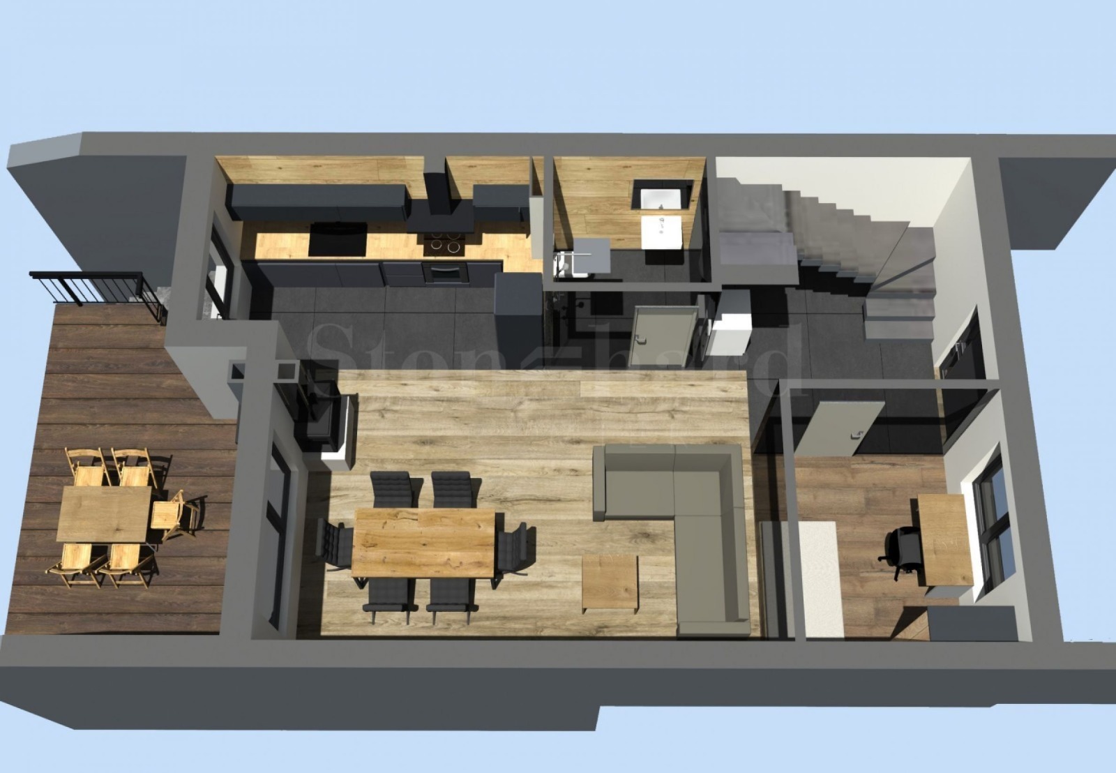 Ниво партер: Дневна с кухня, тоалетна за гости, кабинет, антре, тераса към двора.