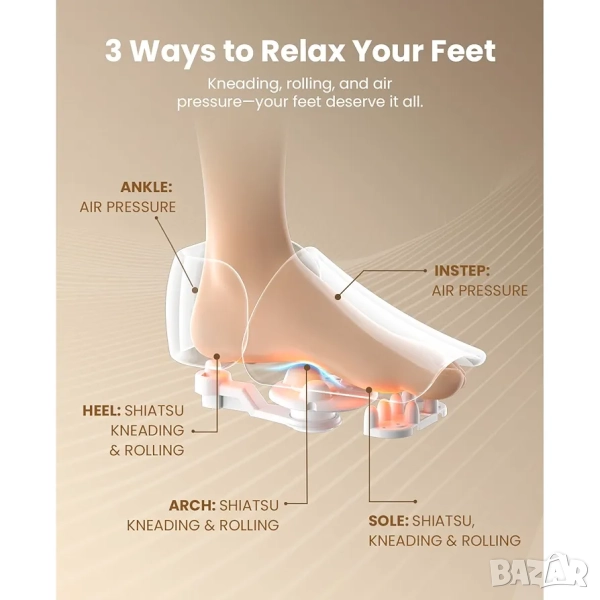 Успокояваща топлинна терапия за релаксация: подобреният електрически масажор за крака може да се нагрее за секунди, може да достигне температура до 55*C. Той предлага две избираеми нива на загряване - ниско или високо, и осигурява безопасна топлина, която е особено успокояваща в студено време. Той помага за подобряване на кръвообращението, намаляване на умората и насърчаване на по-добър сън. С възможност за изключване на функцията за отопление през по-топлите дни.