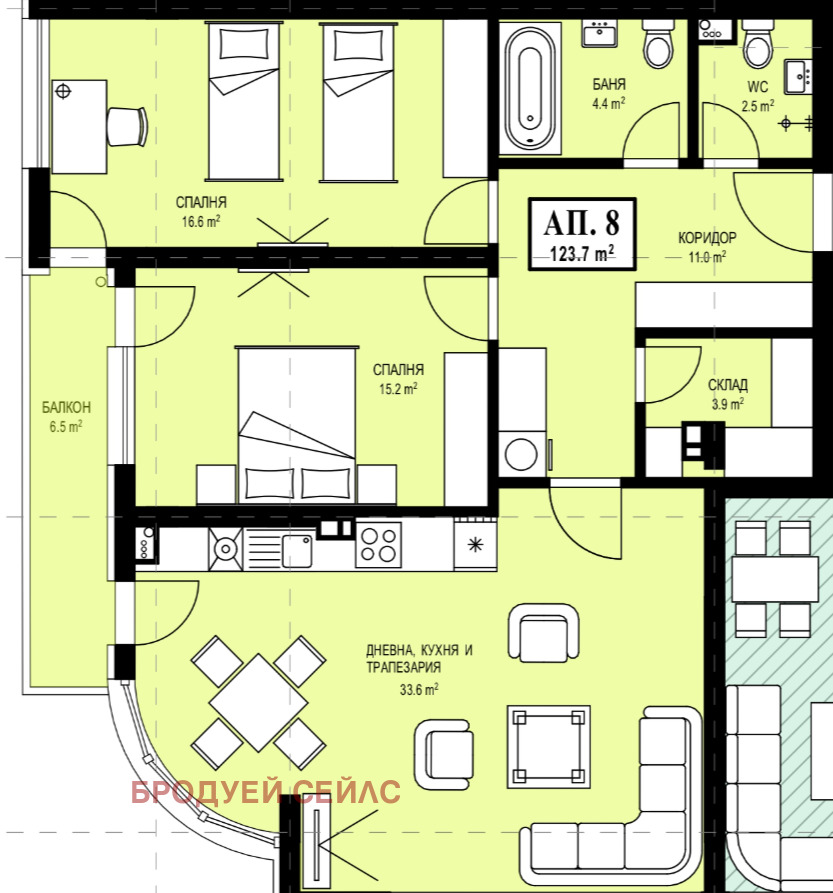 тристаен апартамент с разгърната площ от 124 кв.м, разположен на 2-ри етаж от 6 в модерна новострояща се сграда, само на 50 метра от метростанция 'Красно село'.