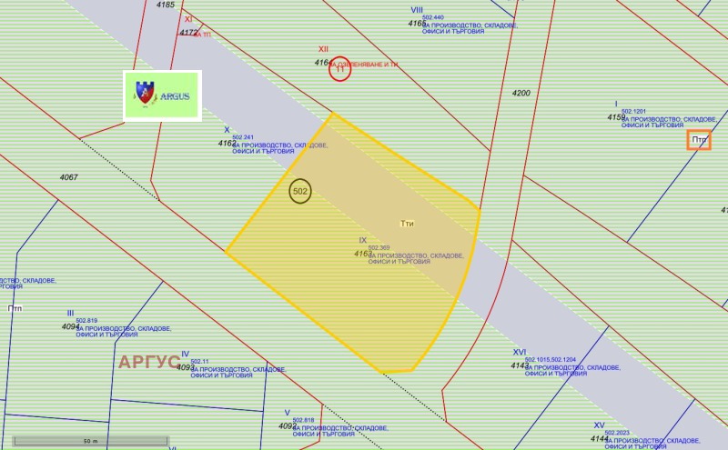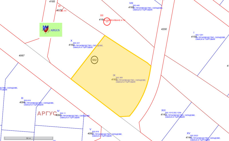 Агенция 'АРГУС' продава парцел УПИ IX-502.369 в изключително ПЕРСПЕКТИВНА част на ПЗ 'Илиянци' - Изток. Добра локация с бърз достъп по бул. 'Илиянци' и в близост до ЖП гара 'Илиянци' и подхода за Северна Тангента. За кв.11 по плана на района има влязъл в сила ПУП по чл.16, като от всички бивши имоти площите за улици са отчуждени и са конституирани урегулирани поземлени имоти /УПИ/. Парцелът е с лице на две улици и попада в устройствената зона Птп - зона за високотехнологични производства, с показатели: плътност 30% и Кинт 1.2. Имотът е подходящ за изграждане на сграда за производство, складове, търговски център с офиси.