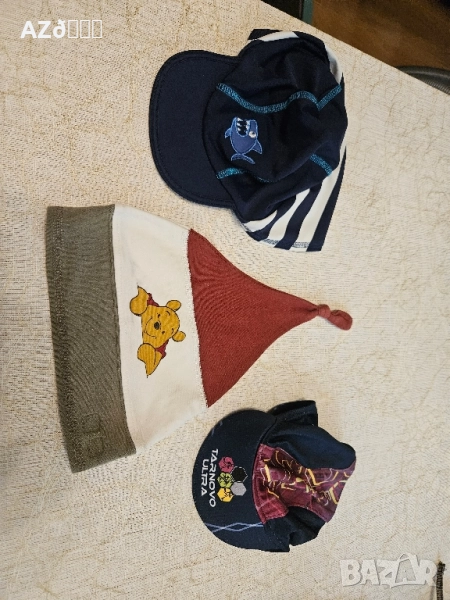 Всяка шапка по 1€ , Мечо пух е от 100% памук, другите две шапки са слънцезащитни.