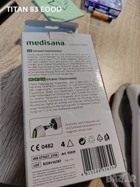 Medisana™ A67 е безконтактен термометър, използващ инфрачервена технология, който измерва телесната температура. По време на употреба е необходимо, наред с други точки, да се стабилизира точката на измерване на челото, което осигурява бързо и точно измерване.