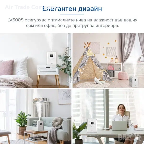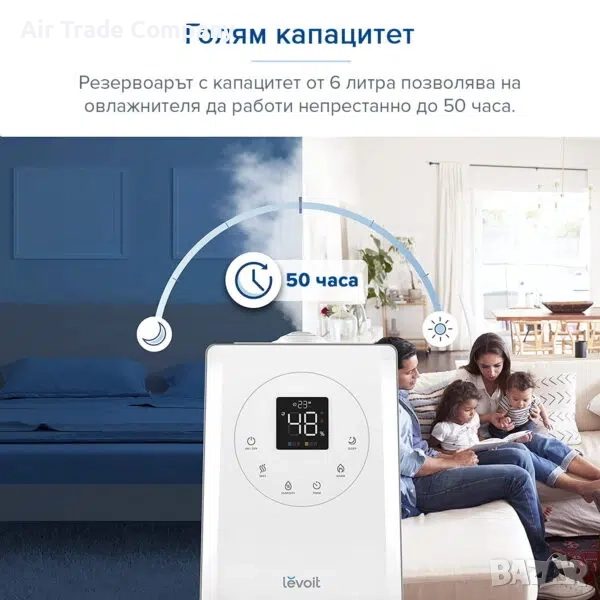 С капацитет на резервоара от 6 литра и възможност за непрекъсната работа до 50 часа, този овлажнител е подходящ за помещения до 70 квадратни метра. Това го прави отлично решение както за големи стаи, така и за офиси.