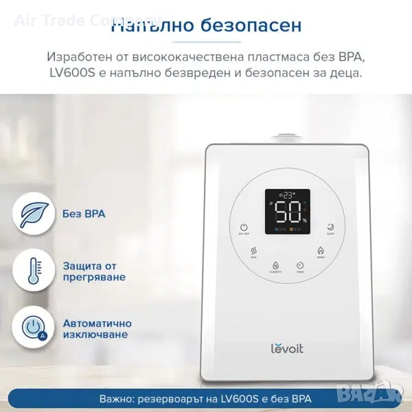 Резервоарът на Levoit LV600S е изработен от висококачествена пластмаса без BPA, което го прави безопасен за цялото семейство, включително и за малки деца.