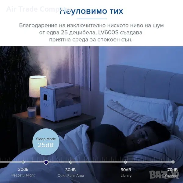 Със звукова мощност от едва 25 децибела, овлажнителят е толкова тих, че може да се използва дори по време на сън или работа, без да нарушава спокойствието.