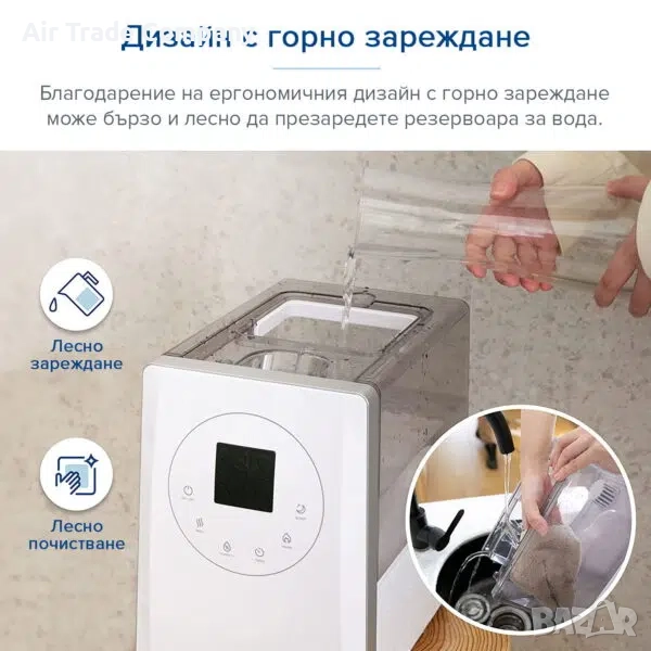 Дизайнът с горно зареждане позволява лесно и удобно пълнене на резервоара. Широкият отвор и включената четка улесняват почистването, като гарантират безпроблемна ежедневна употреба.