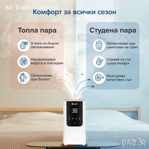 Овлажнителят предоставя възможност за настройка на топла или студена пара в зависимост от вашите нужди и сезона. Топлата пара е идеална за зимните месеци, докато студената освежава и овлажнява въздуха през лятото.
