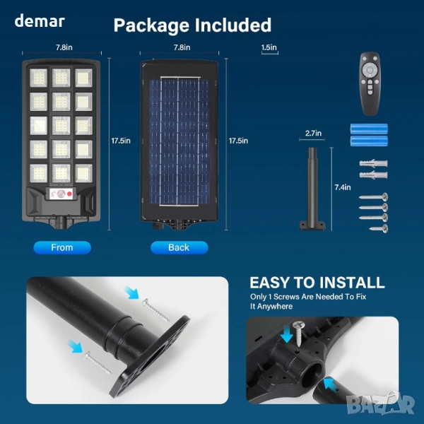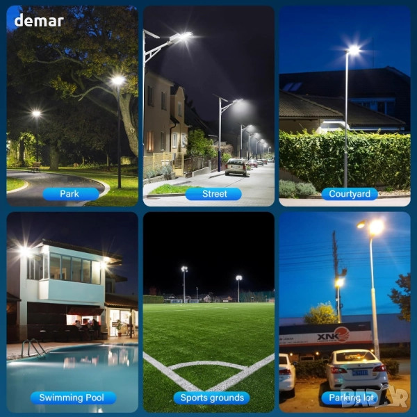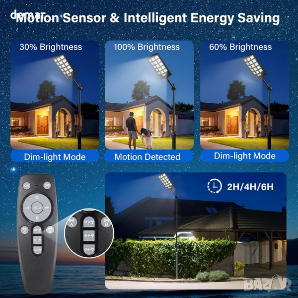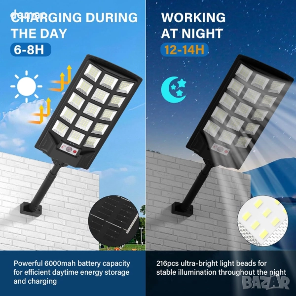 Тази соларна външна лампа с мощност 600 W осигурява ярка бяла светлина с цвят 6500K, захранвана от издръжлива батерия с капацитет 10 000 mAh, осигуряваща до 8 часа осветление. Тя разполага с подобрен PIR сензор за движение с широка зона на покритие и регулируеми режими, включително сензори за светлина и движение, управлявани чрез дистанционно управление с множество опции за яркост и време. Изработена със здрав ABS корпус, тя е водоустойчива по стандарт IP65, устойчива на атмосферни влияния и работи при екстремни температури. Лесна за инсталиране без окабеляване, тя е подходяща за различни външни пространства, като улици, градини, паркинги и дворове.