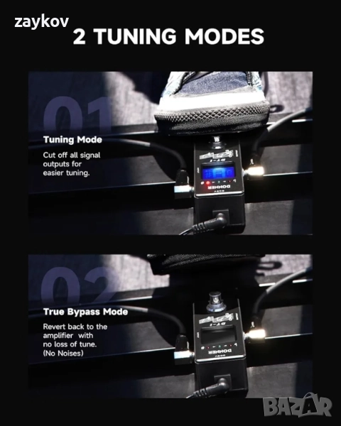2-режимен тунер педал: В режим Тунер можете да изключите целия изходен сигнал и да настроите фино китарата си. В режим Байпас звукът на китарата ви ще се върне към усилвателя без загуба на настройка. Без досадни пукащи или бръмчащи звуци.