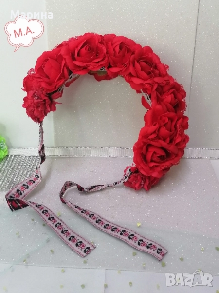 Красива обемна китка за глава от изкуствени червени рози, 15бр .