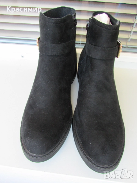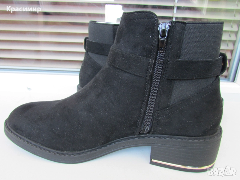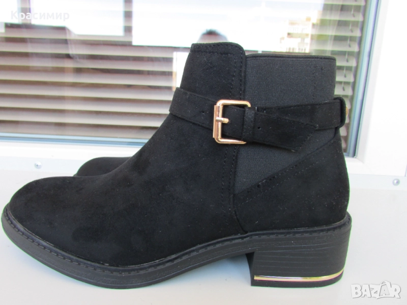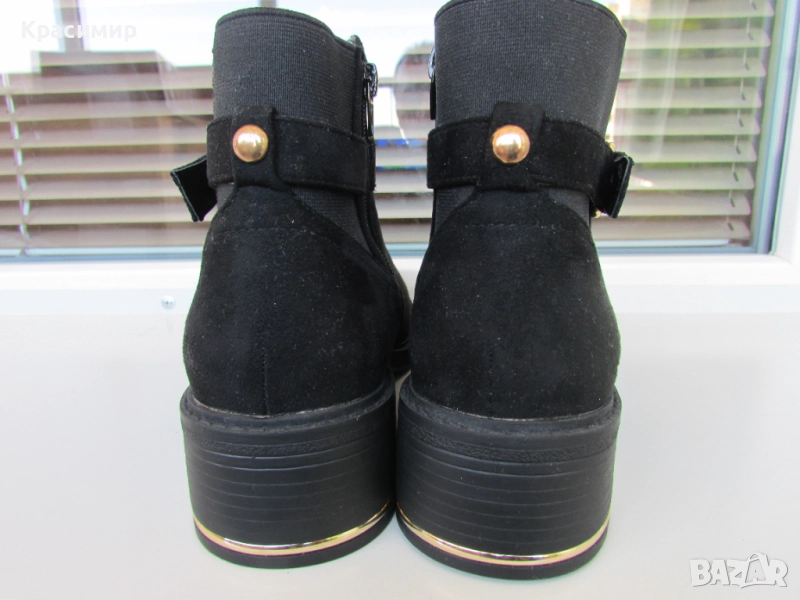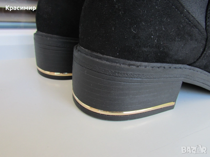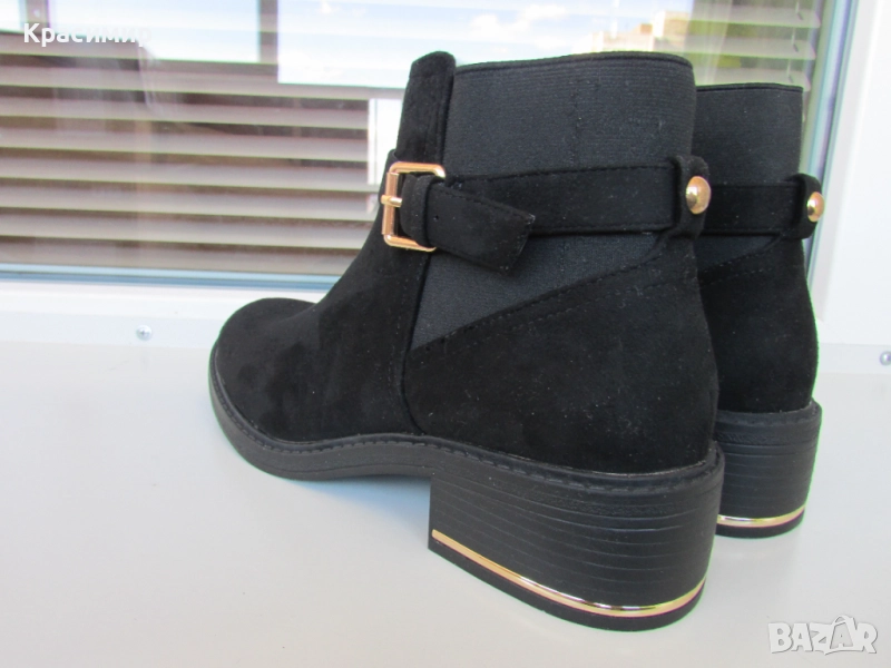 7: Нови дамски боти на английската марка - Dorothy Perkins, изработени от велур в черен цвят, като задната половина е еластична. С черна каишка около глезена, съединяваща се със златиста катарама, златиста капса отзад и ефектна златиста лайсна на тока. Височина -16 см. Номер 39 с дължина на стелката 25 см. Разполагам с два чифта.