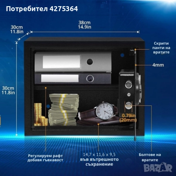 Заключване: Цифров код (3–8 цифри) + 2 аварийни ключа;