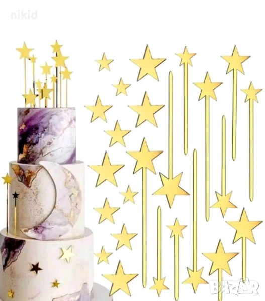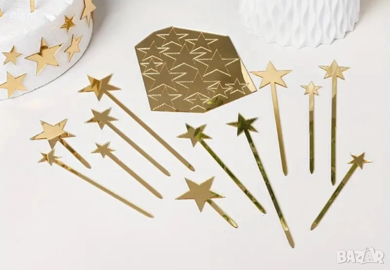 12 бр златни златисти звезди звездички звезда акрилни топери украса декор за торта мъфини кексчета → Обява 51726745
