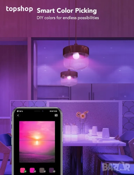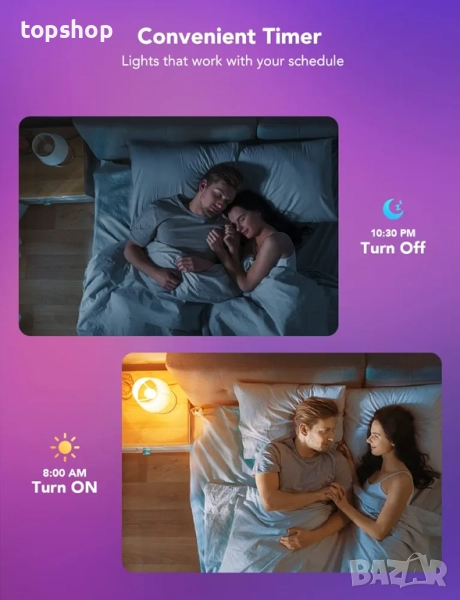 Таймер и график: Прилагането на тези интелигентни крушки към ежедневието ви вече е по-лесно от всякога с функциите на таймера и режимите като Изгрев и Залез. Останете енергични сутрин или се отпуснете след дълъг ден. Забележка: Не може да се използва с интелигентни превключватели.