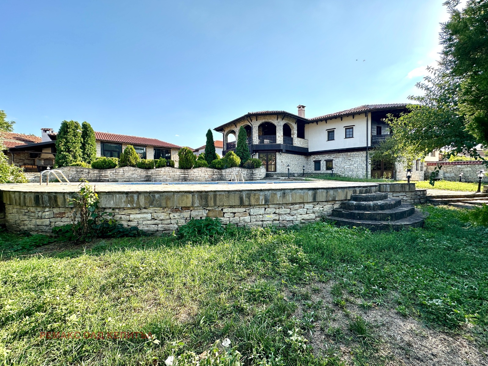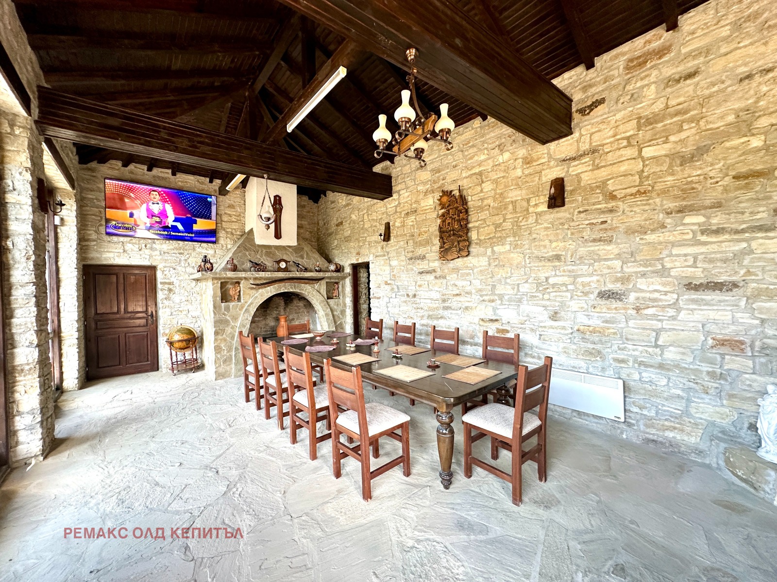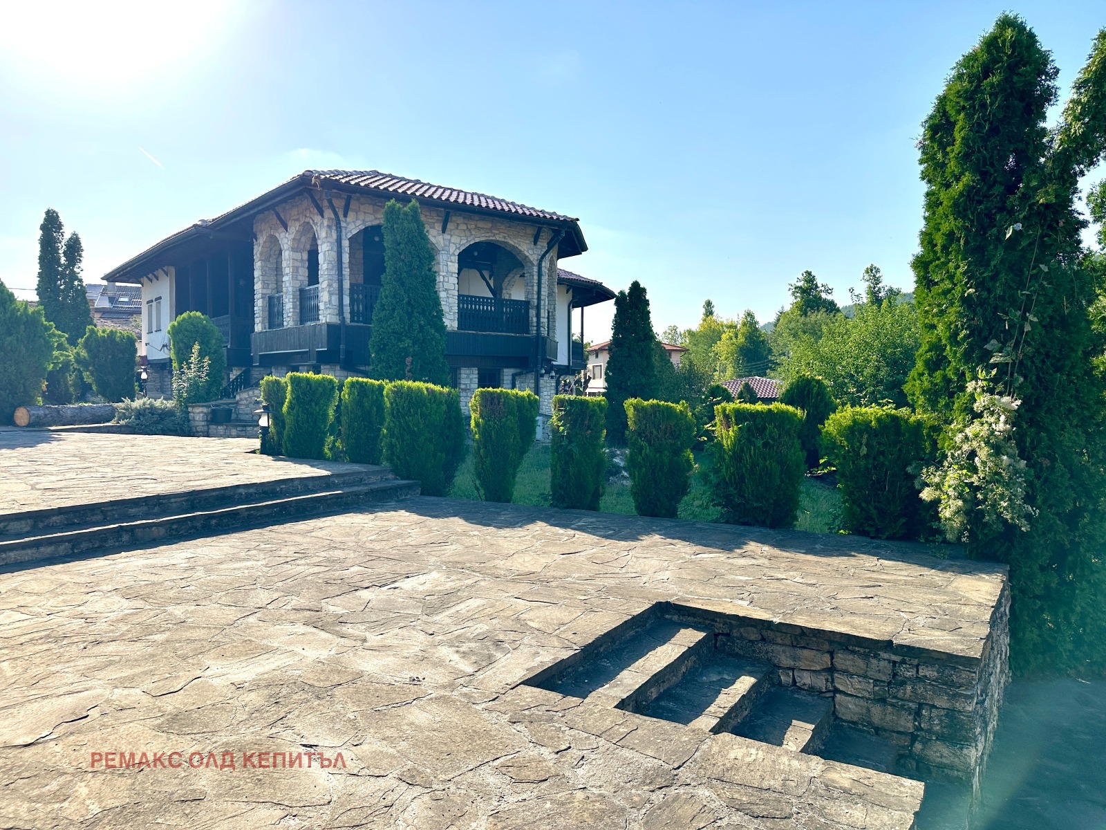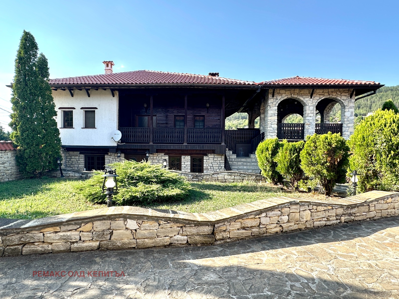 Представяме Ви изключителен имот с разгъната застроена площ от 481 кв.м, разположен в двор от 2800 кв.м, ограден с масивни двулицеви каменни дувари, които осигуряват уединение, сигурност и усещане за престиж. Къщата е построена и обзаведена с висококачествени материали, а мебелите са изработени по индивидуална поръчка, което придава стил и уникален характер на всеки детайл.