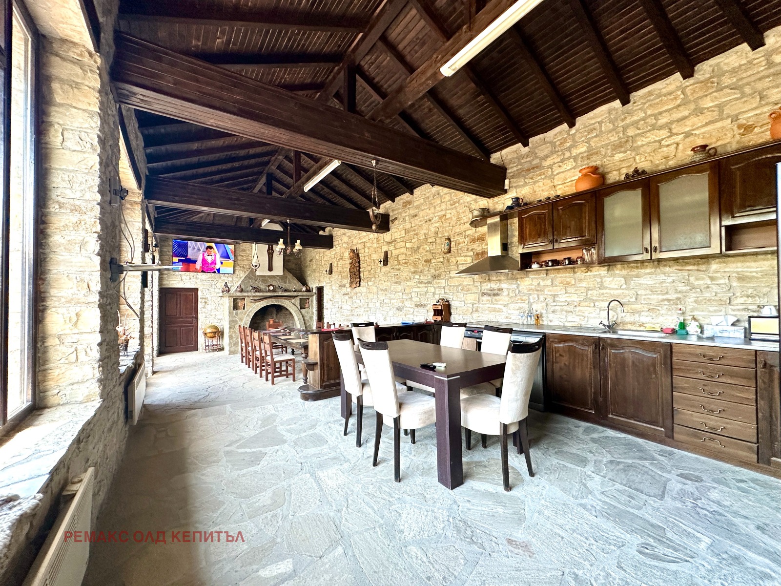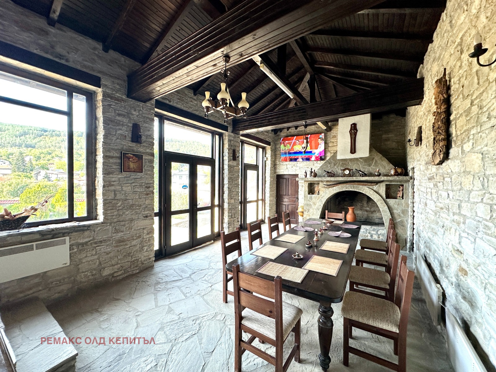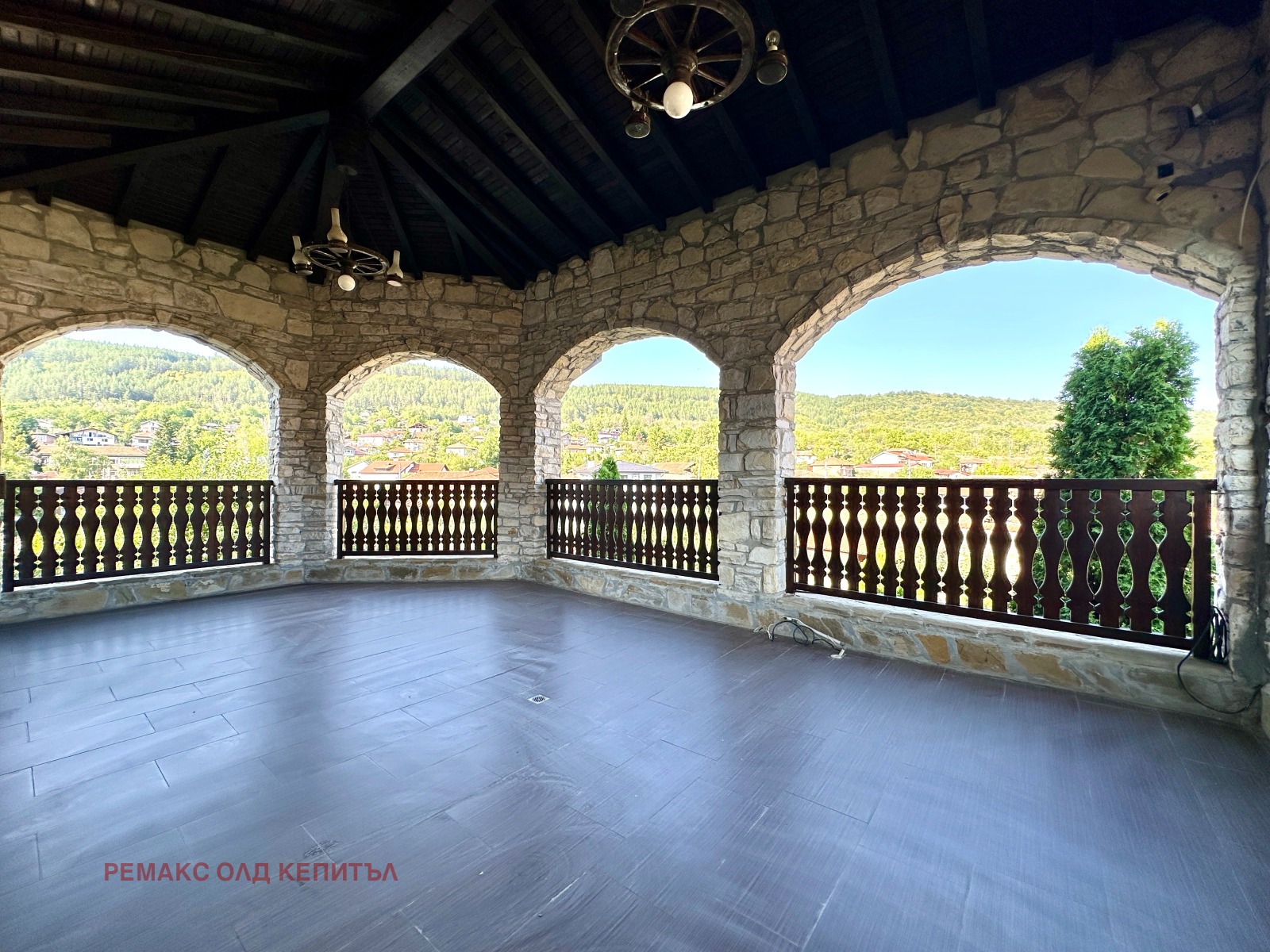 Представяме Ви изключителен имот с разгъната застроена площ от 481 кв.м, разположен в двор от 2800 кв.м, ограден с масивни двулицеви каменни дувари, които осигуряват уединение, сигурност и усещане за престиж. Къщата е построена и обзаведена с висококачествени материали, а мебелите са изработени по индивидуална поръчка, което придава стил и уникален характер на всеки детайл.