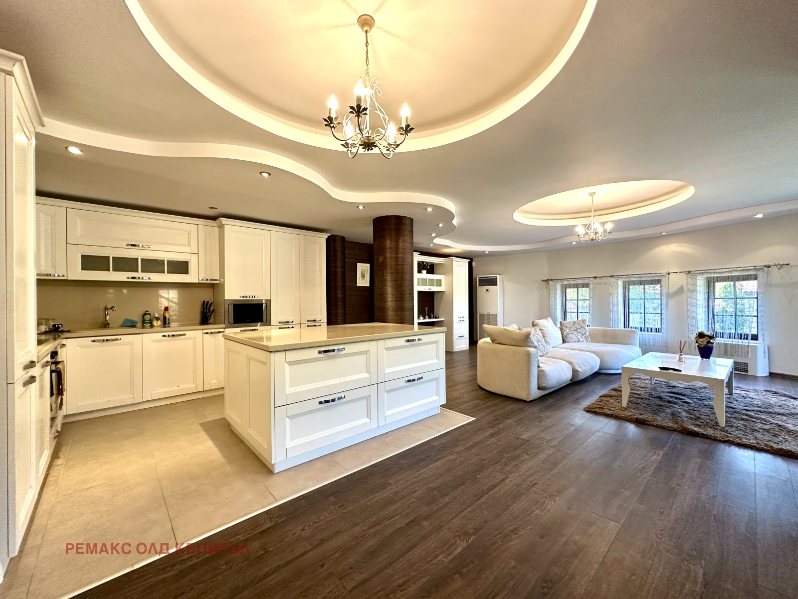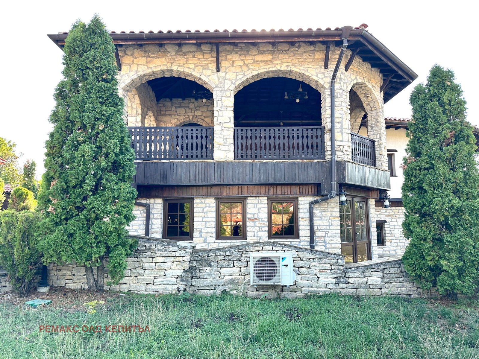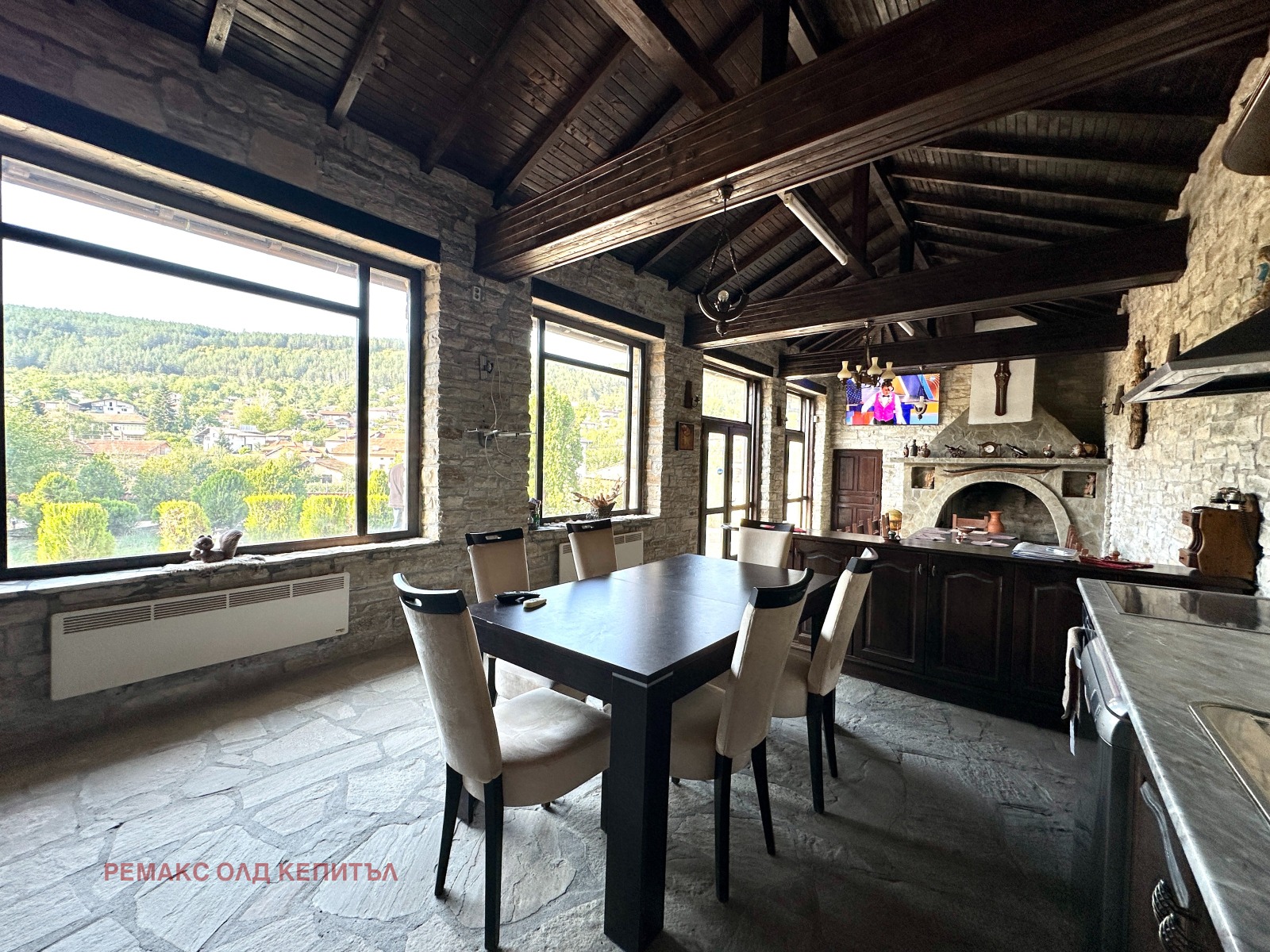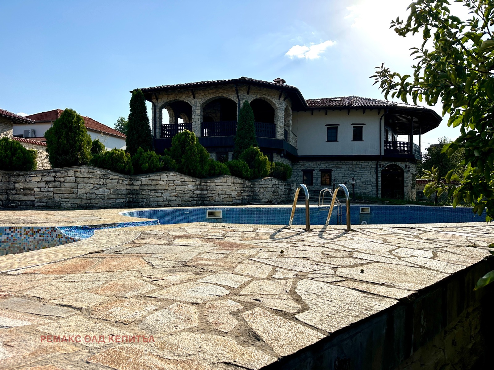 Представяме Ви изключителен имот с разгъната застроена площ от 481 кв.м, разположен в двор от 2800 кв.м, ограден с масивни двулицеви каменни дувари, които осигуряват уединение, сигурност и усещане за престиж. Къщата е построена и обзаведена с висококачествени материали, а мебелите са изработени по индивидуална поръчка, което придава стил и уникален характер на всеки детайл.