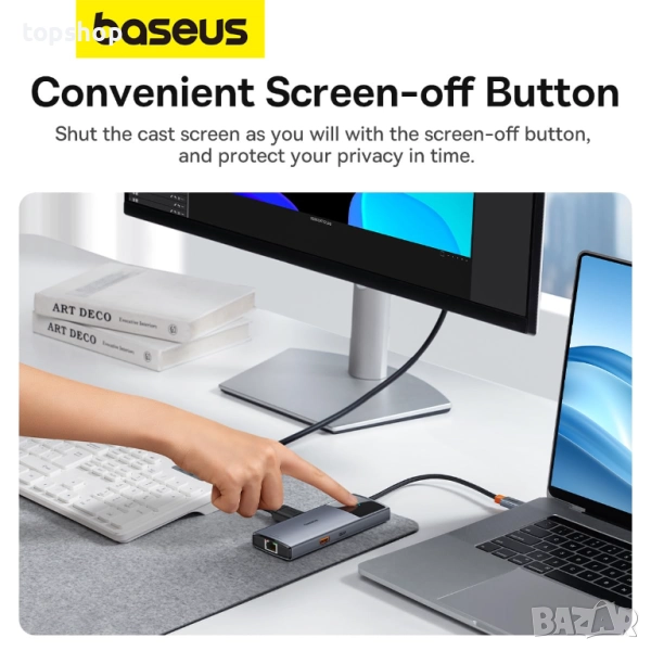 Грижа за поверителност: Baseus Metal Gleam Series II е хъб, оборудван с функция за предаване на екрана, която му позволява да предава информация от един екран на друг. За безопасността на вашите данни устройството е оборудвано с бутон, който при натискане изключва екраните, без да е необходимо да изключвате хъба.