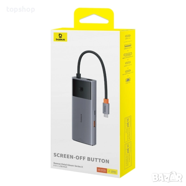 Нов хъб Baseus Metal Gleam Series 6-в-1 USB Type C HUB 1x HDMI 4k @ 60Hz, 1x USB-C (10Gbps), 2x ...