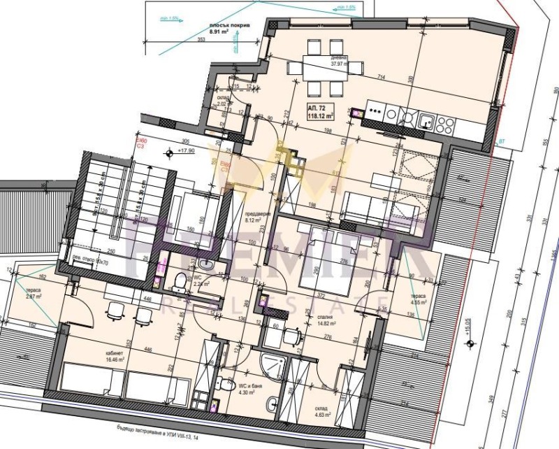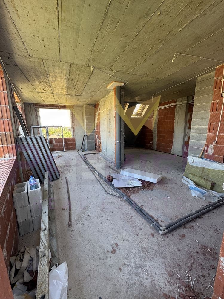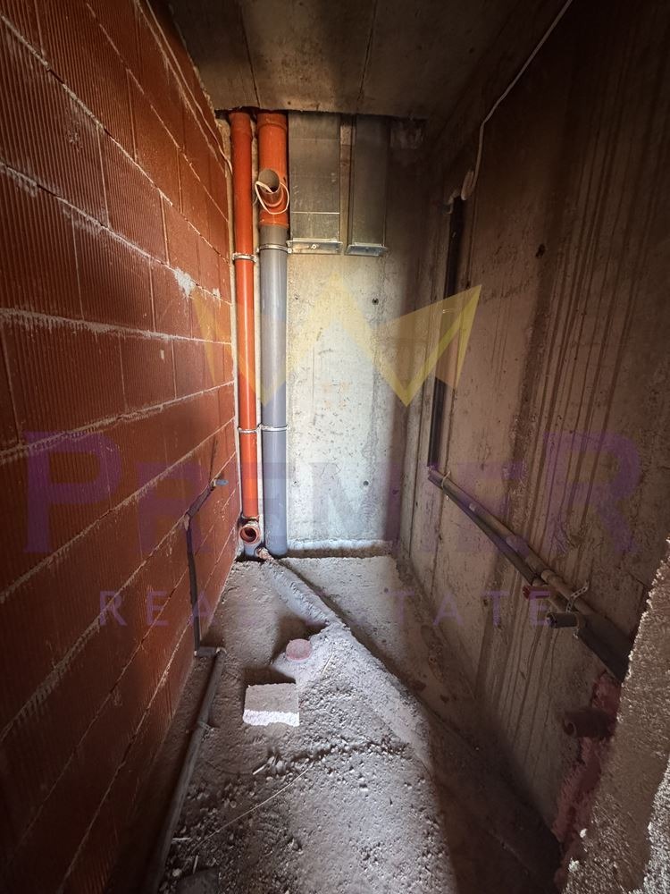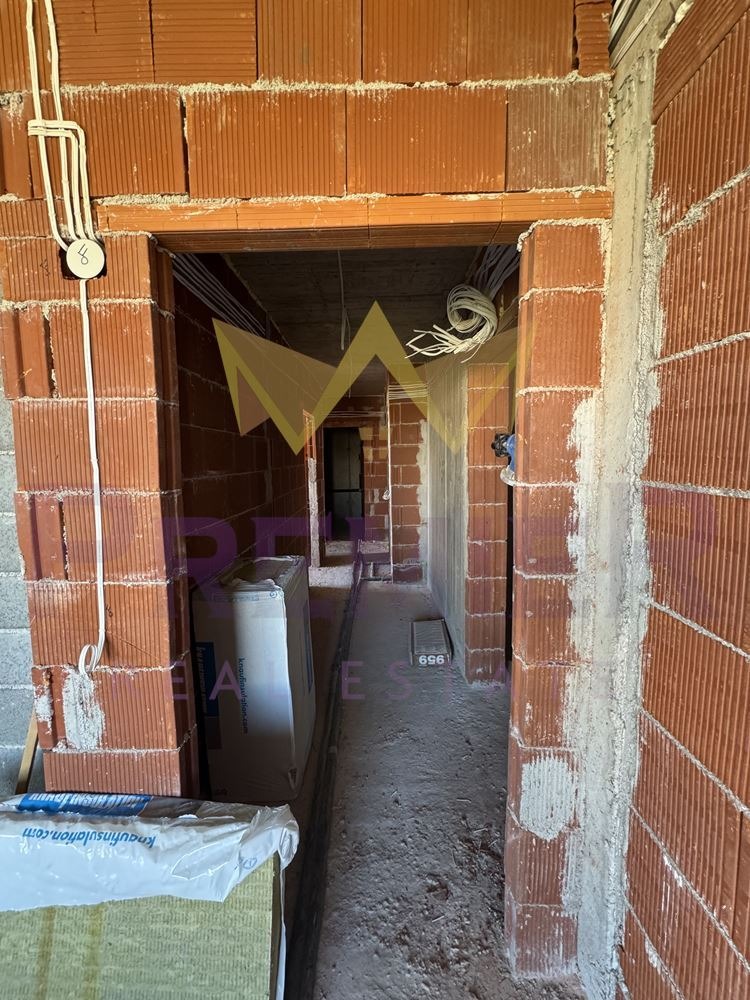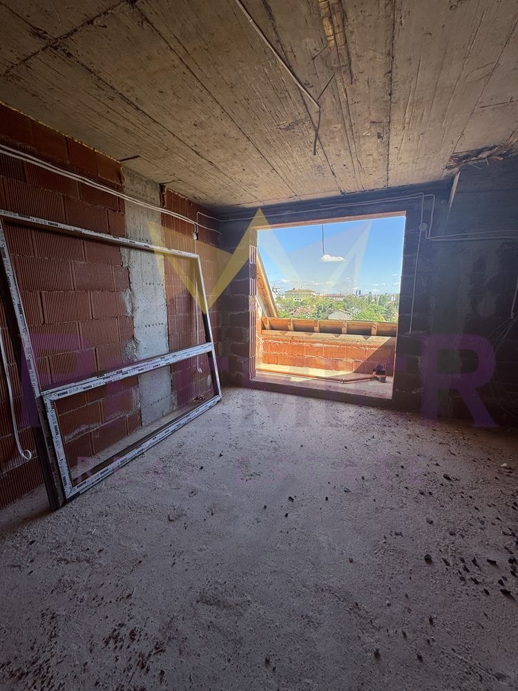 С акт 14. Акт 16 се очаква през средата на 2026 г. Жилището е ситуирано на етаж 7/7 в сграда със собствен двор и контрол на достъпа. Обща площ от 135 кв.м. с разпределение както следва: входно антре, дневна, кухненски бокс с трапезария, две спални, две бани със санитарен възел, два балкона и покривна тераса (извън квадратурата). Отоплението е на ток с изградено трасе за климатици.