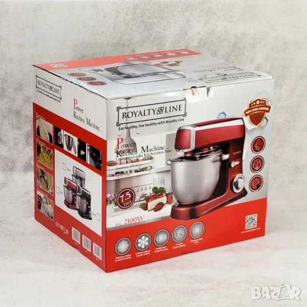 Мощен Планетарен миксер Royalty Line, 2100W, 7.5 литра, 6 скорости + Pulse, 3 бъркалки, Червен