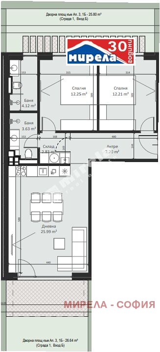 Имотът има следното разпределение: коридор, дневна с кухненски бокс, две спални, две бани с тоалетна, склад и дворна тераса с площ от 52.44кв.м.