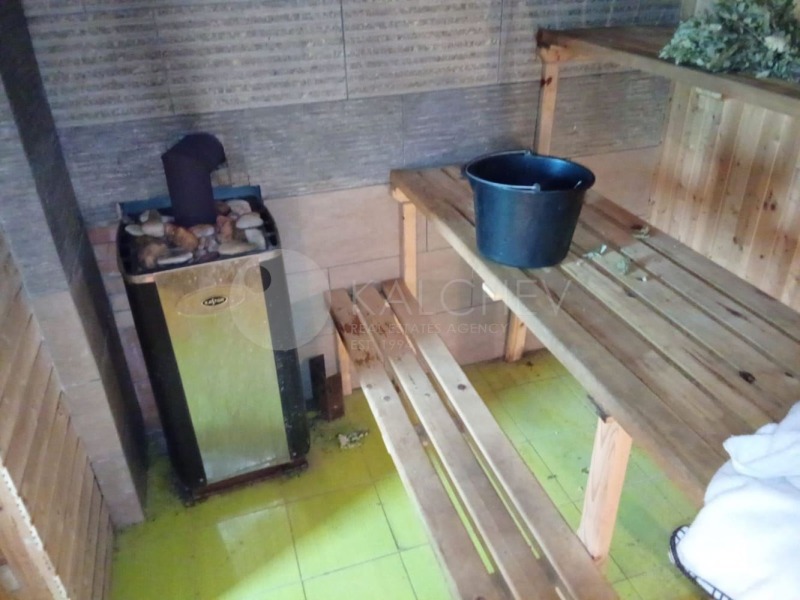 Лятна кухня преустроена в сауна, с душ, стая за отдих (25 кв.м) и тоалетна. Има и покрита тераса (20 кв.м).