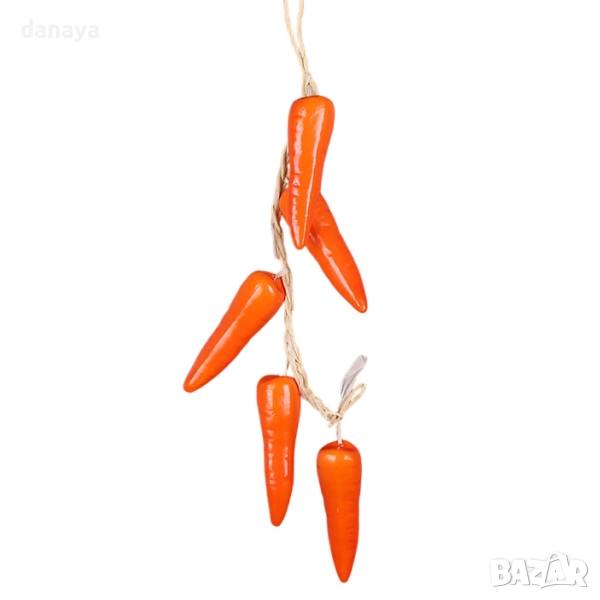 Изкуствени моркови на връзка – перфектни за декорация на дома, градината, училищни проекти или тематични празници. Всяка връзка съдържа 5 броя моркови, изработени от висококачествен стиропор, а връзката е от креп хартия за естествен и устойчив вид. Морковите са с дължина 15 см, а общата дължина на връзката е 60 см, което ги прави подходящи за украса на рафтове, витрини или декоративни кошници. Ярки, реалистични и лесни за аранжиране – добавете свеж и забавен акцент във вашия интериор.