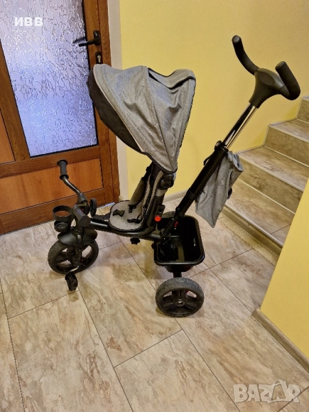 Използвана е 5-6 пъти. Наличните функции са: 3-точкови предпазни колани с меки капаци. 2в1 функция - триколка с родителски контрол и детски триколесен велосипед; Въртяща се на 360 градуса седалка; Управление на предното колело от родителския контрол; Непомпащи се гуми от мека PU пяна с протектор; 3-точкови предпазни колани с меки подложки; Регулиращ се родителски контрол.Мека и удобна дръжка на родителския контрол; Прозорче с мрежа в сенника за наблюдение на детето;Плътна, мека и изключително приятна тапицерия на седалката; Заключващ мек предпазен борд за допълнителна защита; Противоплъзгащи ръкохватки на кормилото; Поставка за бутилка/чаша; Чанта за съхранение; Кош за аксесоари; Спирачки на задните колела; Защита от нараняване на предното колело; Възможност за блокиране на предното колело; Функция свободно предно колело; Бързо и лесно сглобяване; Сгъване до много компактен размер; Покрива стандарт EN71