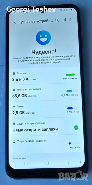 Телефона е с вградена 128 gb памет, 6 Gb Ram и допълнително включена 128 gb micro SD карта.