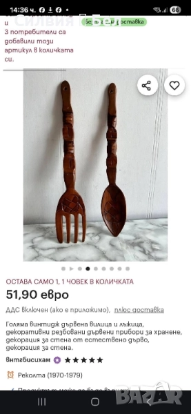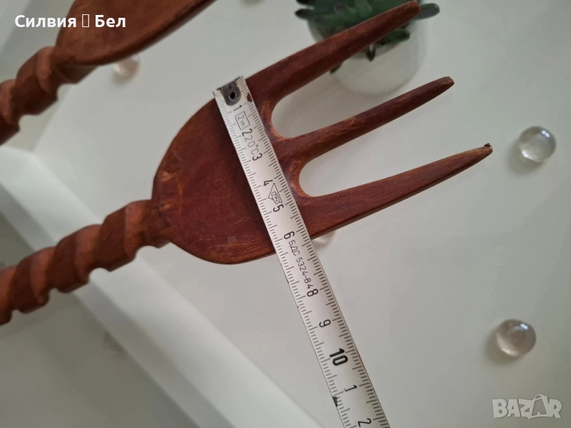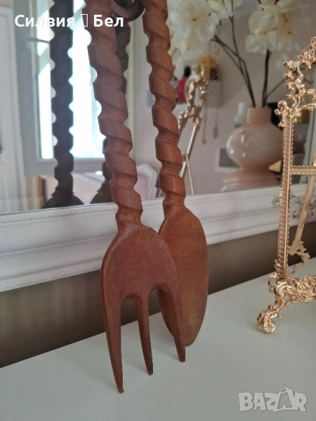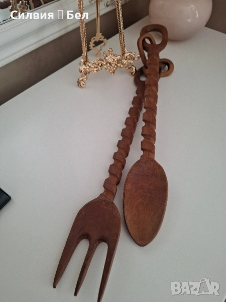Декоративни прибори огромен размер Винтидж комплект, дървени прибори за салата, състоящи се от вилица и лъжица, свързани с декоративна дървена верига в горната част. Дръжките на приборите са с резбован спираловиден дизайн, което им придава уникален и ръчно изработен вид. Тези прибори са подходящи като декоративен елемент в кухнята или трапезарията. Цена 7️⃣️0️⃣лв.35,79 € ⊱❥─❥⊱💜✿⊱╮☆♪ ░L░o░V░e░❥─❥⊱💜✿⊱╮💜☆♪ღ💜ღ꧂ღ