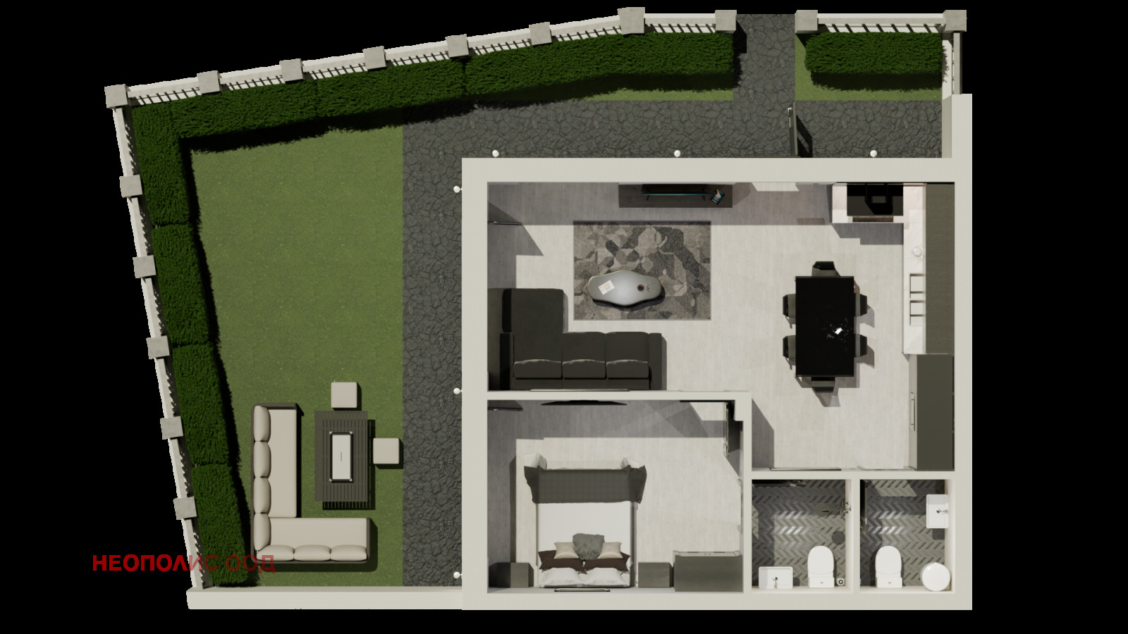 Жилището се състои от всекидневна, спалня, 2 броя бани - WC и склад.