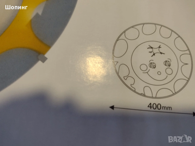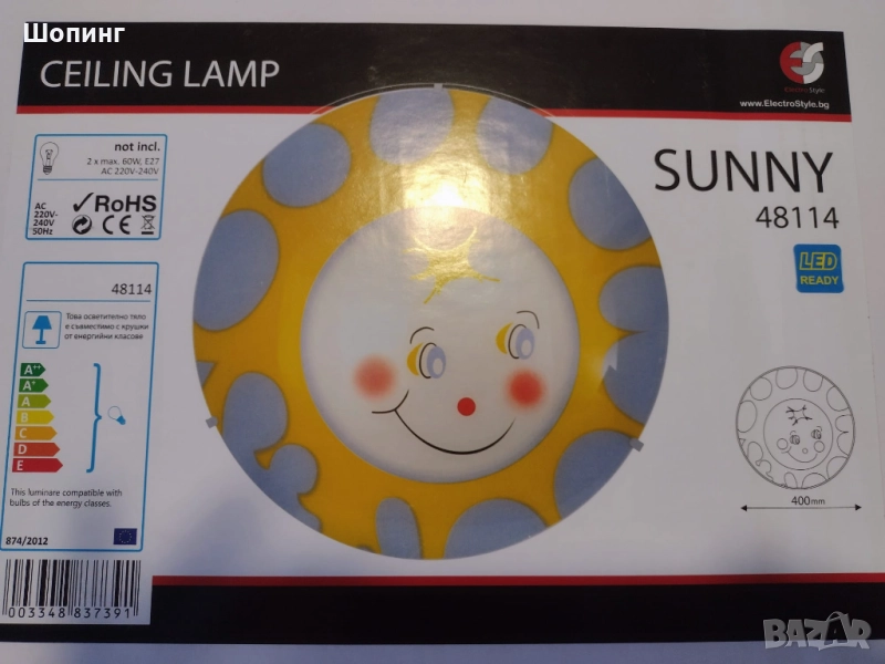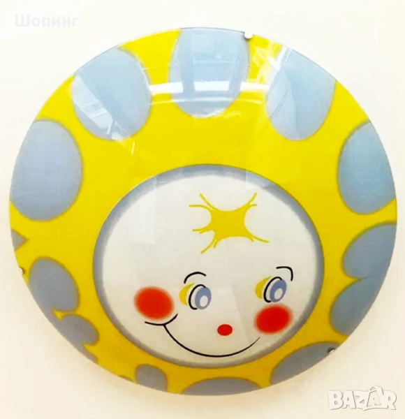 ЧИСТО НОВ в кутия с всичко необходимо! LED лампа за таван, рисувано стъкло усмихнато слънце. Изработено от качествени здрави материали. Голям, 45 см, подходящ за декоративно осветително тяло за детска стая или друго помещение, в което искате да внесете допълнителна доза настроение и усмивки по лицата на любимите хора. Разгледайте подробностите в снимки.