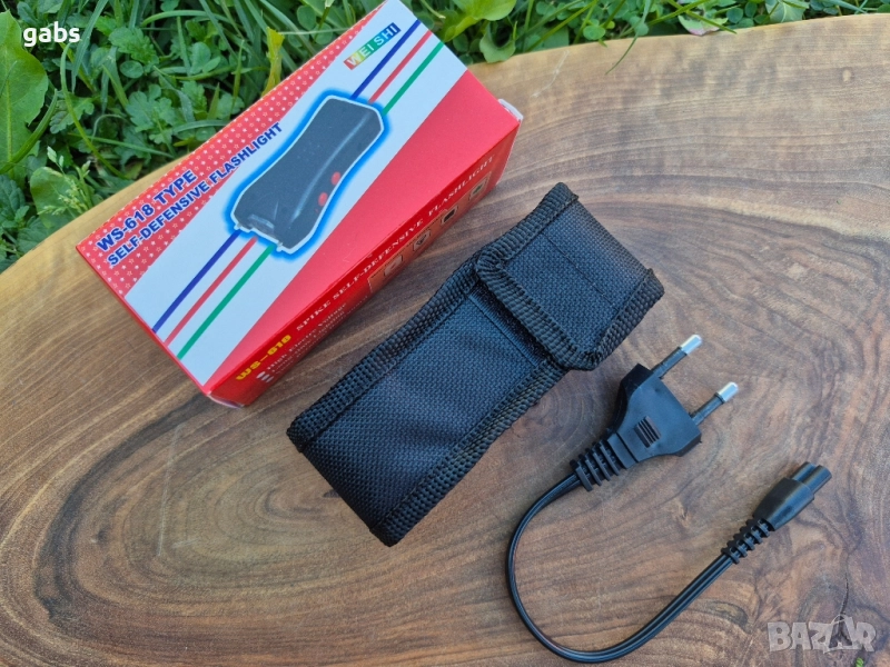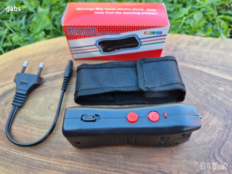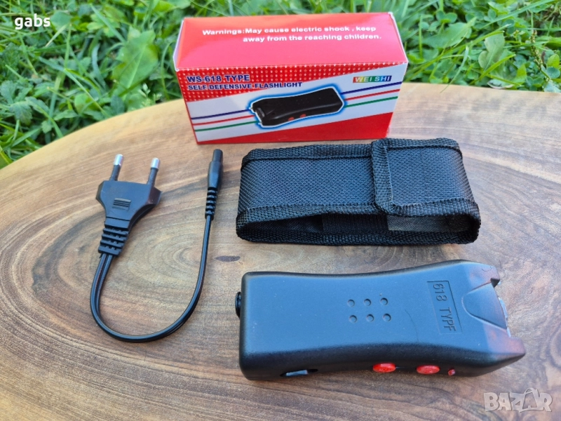 електрошок WS 618 TYPE.Въпреки малкия си размер, той е много силен и може да повали човек. Той работи с вътрешна акумулаторна батерия. Има предпазен бутон за включване и LED светлина, която може да се използва като фенерче. Поставен е в удобен черен калъф с примка за колан и е лесен за носене в джоба. WS 618 TYPE е компактен и дискретен.
