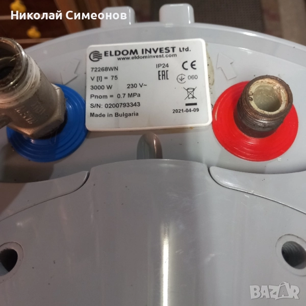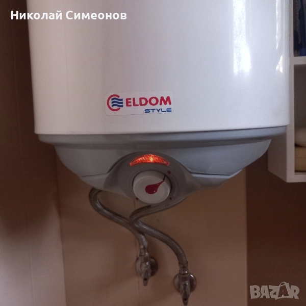 " ЕЛДОМ "Варна с външен диаметър 38 см.Видно от фабричната табелка той е на 4г и 5месеца и е изцяло подновен като е монтиран нов нагревател 3 кв,нов топлинен и температурен регулатор,нов магнезиев анод за удължаване на"живота"му ,и на практика бойлера е НОВ.От вънка също няма забележки по лаковото покритие.