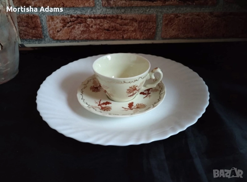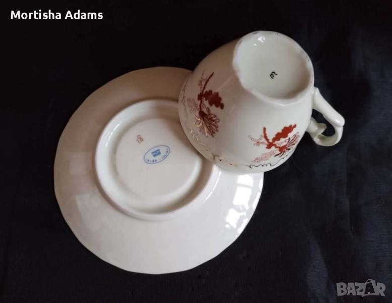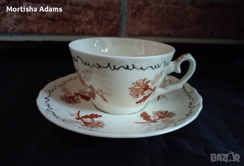 сервиз за кафе, 12 части, неупотребяван. Цветът е екрю, а декорът е червено към кафяво. Печат на производителя имат чинийките.