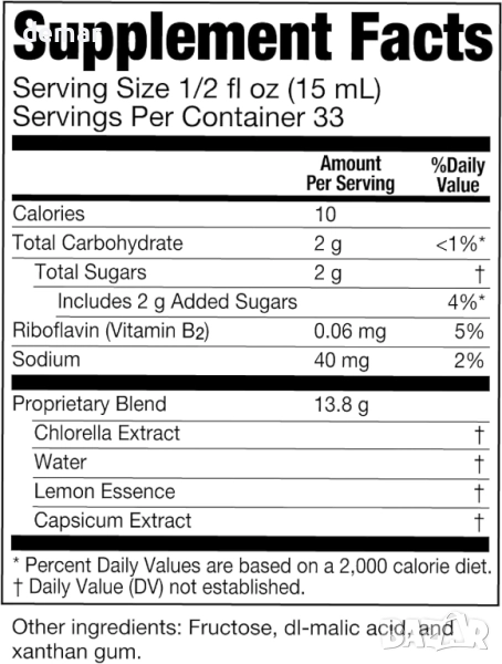 Течен концентрат, получен от ядрото на клетката Chlorella, тази формула е богата на растежен фактор Chlorella и осигурява смес от нуклеинови и аминокиселини, предназначена за прием с вода или сок.