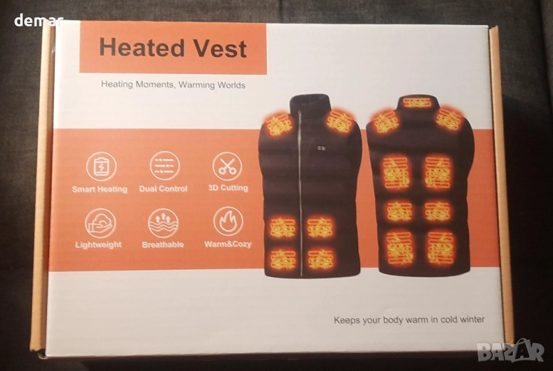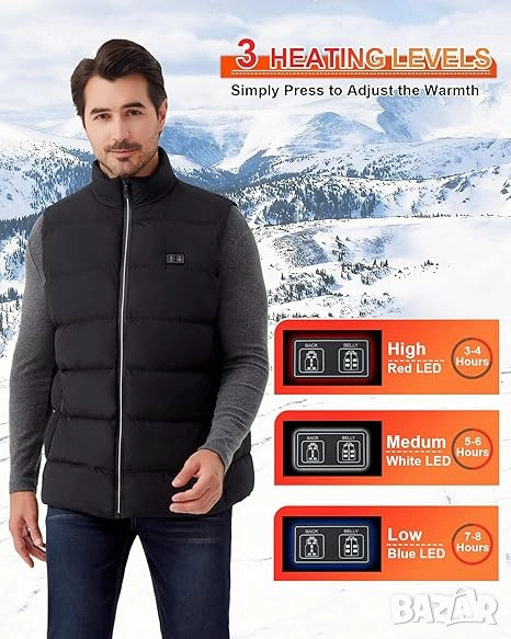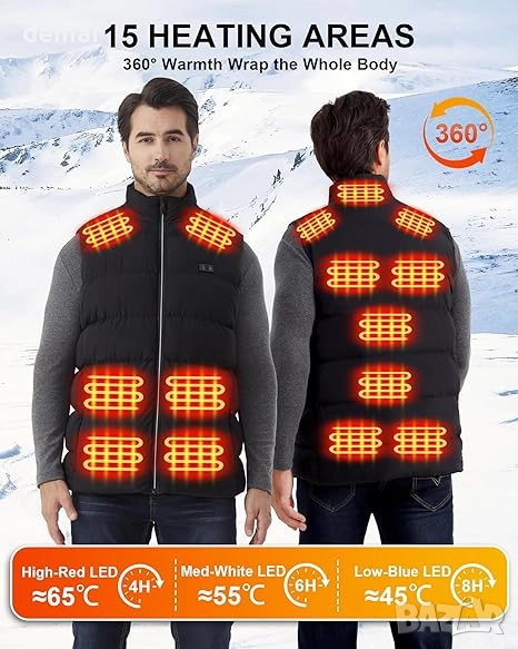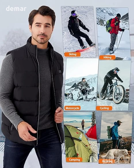 Този отопляем елек разполага с 15 графенови зони за отопление, насочени към корема, врата, талията и гърба, с контрол на температурата отпред и отзад, три регулируеми нива на топлина и бързо загряване за секунди. Захранва се от акумулаторна батерия с капацитет 16000mAh, осигуряваща до 8 часа топлина, а също така включва USB и DC портове за зареждане на устройства. Проектиран за комфорт и неограничено движение, той е подходящ за дейности на открито като ски, туризъм, риболов или ежедневно носене в студено време. Изработен от издръжлива материя, която може да се пере в пералня, той съчетава лесна грижа с надеждна отоплителна ефективност.