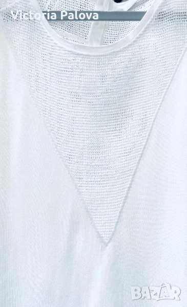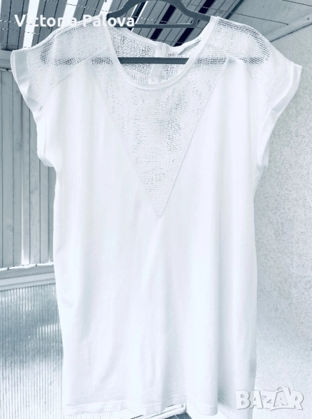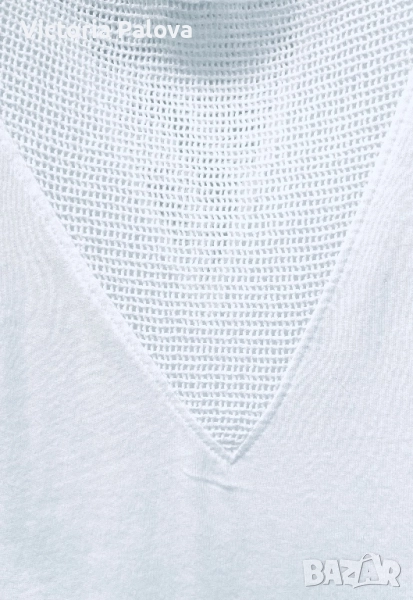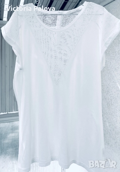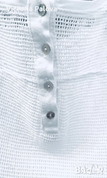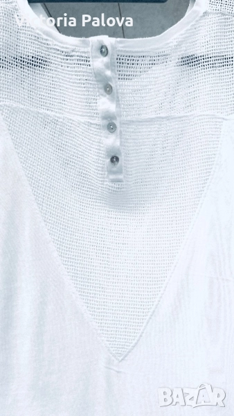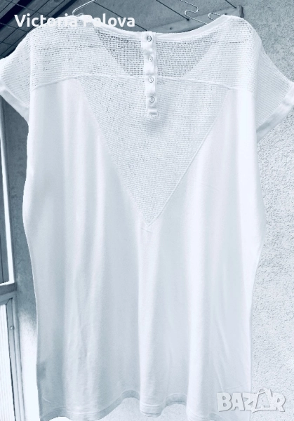 OUI е немска марка с френски акцент и изящество с особено внимание към уникалния трикотаж. Блуза- топ тип тениска с мрежени вставки и натурални седефени копчета, ефектна и красива. Рамо - 63см, ГО - 56см, дължина - 74см.