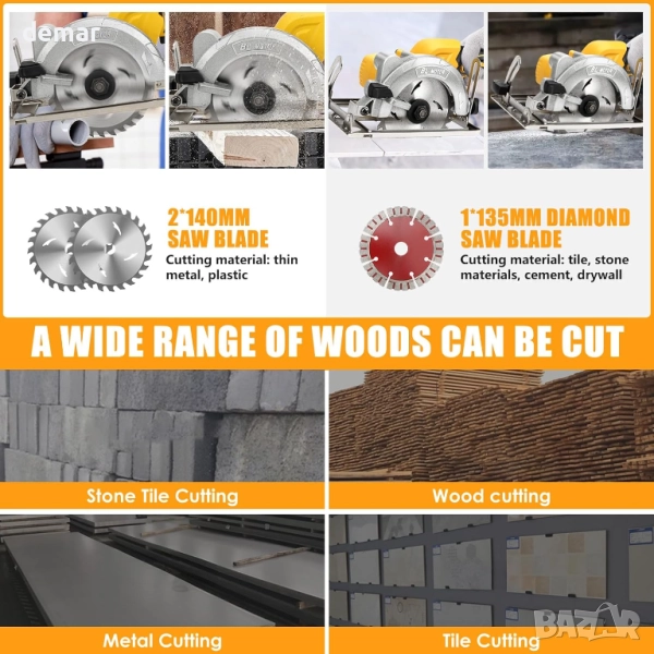 Този безжичен 5-инчов циркуляр, съвместим с батерии Dewalt 18V/20V (не са включени), разполага с мощен безчетков мотор, осигуряващ до 8000 об/мин за ефективно рязане. Той осигурява прецизност с ясни скали, регулируеми ъгли и максимална дълбочина на рязане от 1-1/16", позволявайки както прави, така и скосени разрези до 90°. Проектиран за многофункционалност, той реже с лекота дърво, пластмаса, тънък метал, плочки и други. Безопасността е приоритет чрез стартиране с два бутона, защита от претоварване и прегряване, защитен капак и включени ръкавици и очила, устойчиви на порязване, за допълнителна защита по време на употреба.