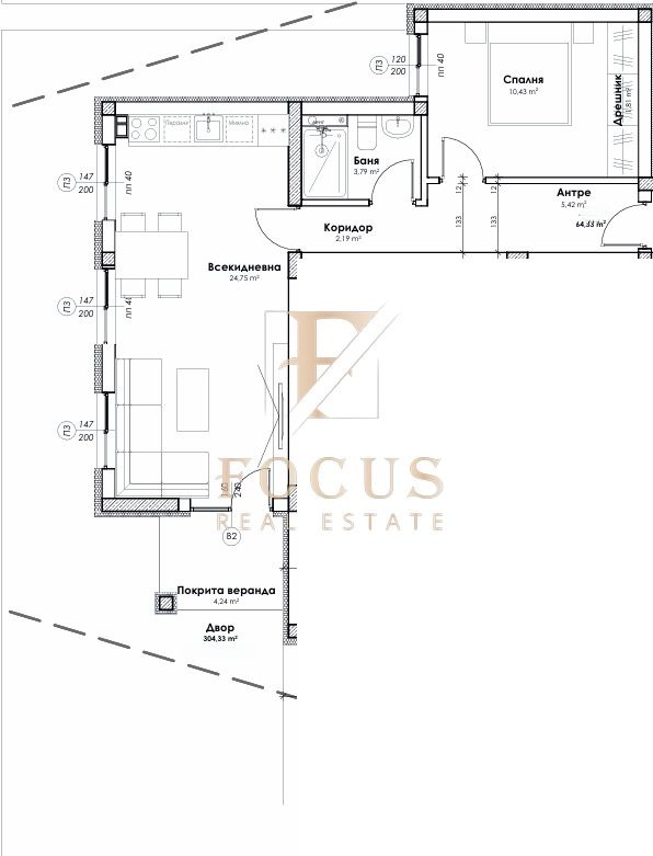 Апартаментът е с обща площ от 72,89 кв.м. със следното разпределение: антре, дрешник, хол с кухненски бокс, спалня и баня с тоалетна. Към апартамента има покрита веранда - 4,24 кв.м. и двор - 304,33 кв.м.