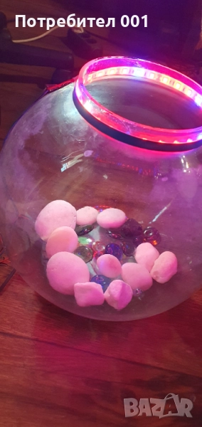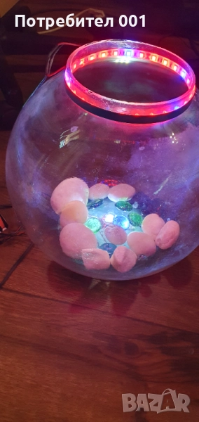 Предлагам кръгъл , сверичен аквариум , оборуден с компресор за въздух , осветление, декорация- бели морски камъни и цветни кристали. Обем 10 л.