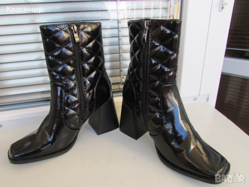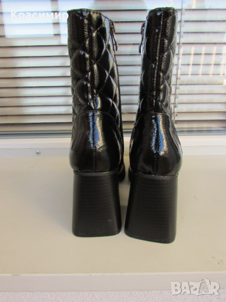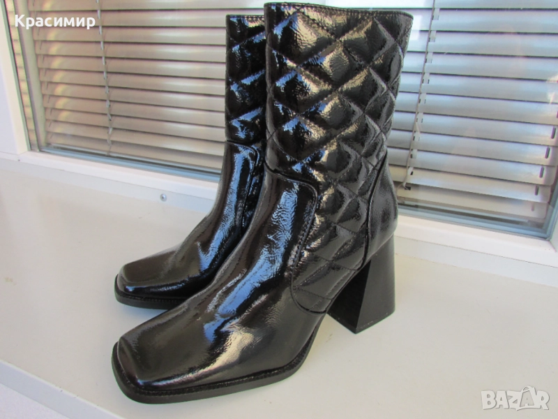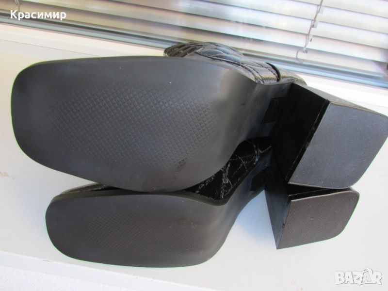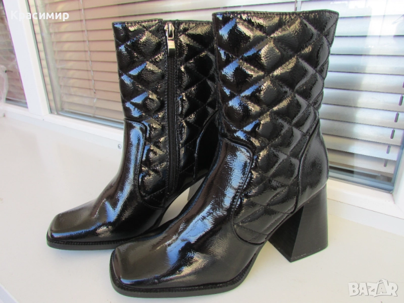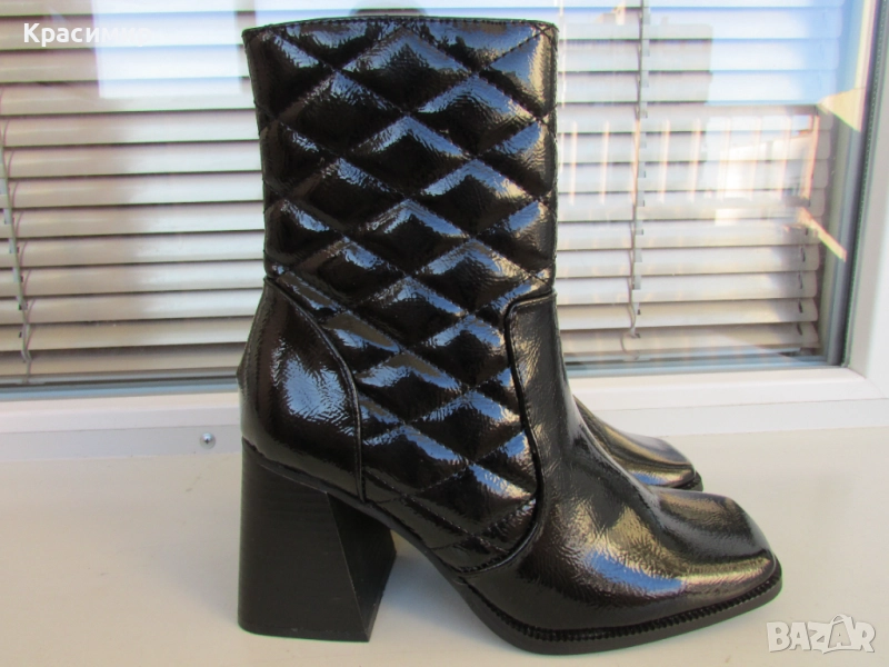 N:39 Дамски боти No Doubt, в комбинация от гладка и тип вафлички лачена кожа. Височината им е 23 см, а на тока 8 см. Закопчаването е с цип от вътрешната страна. Номер 37 с дължина на стелката 23 см.