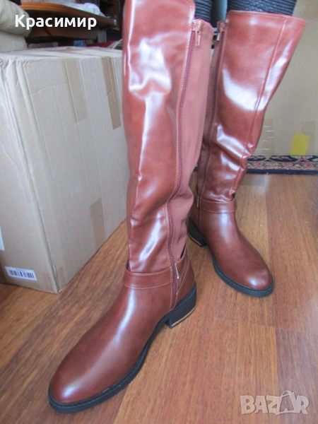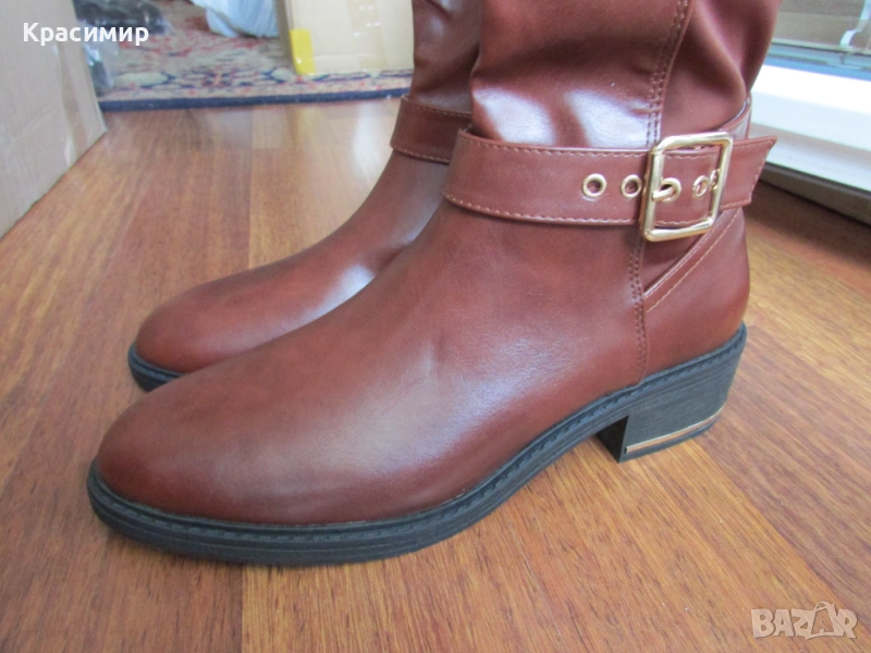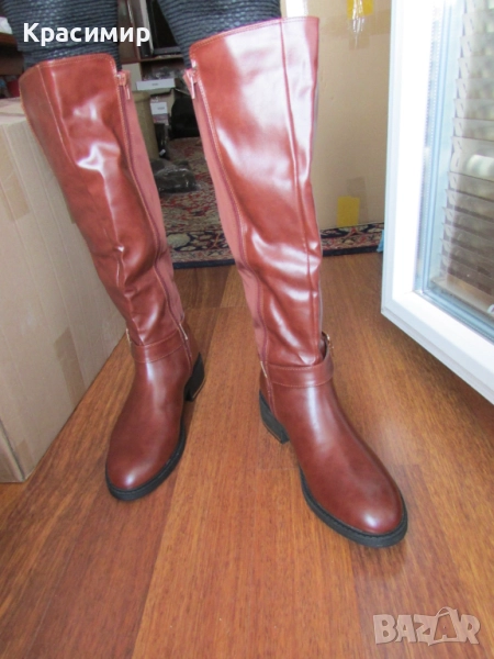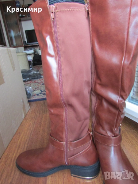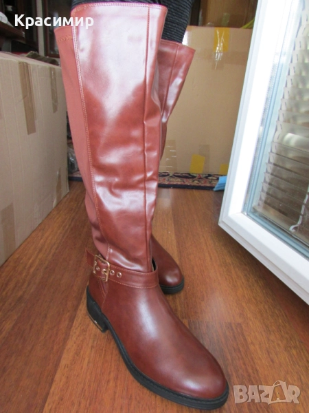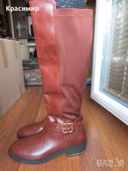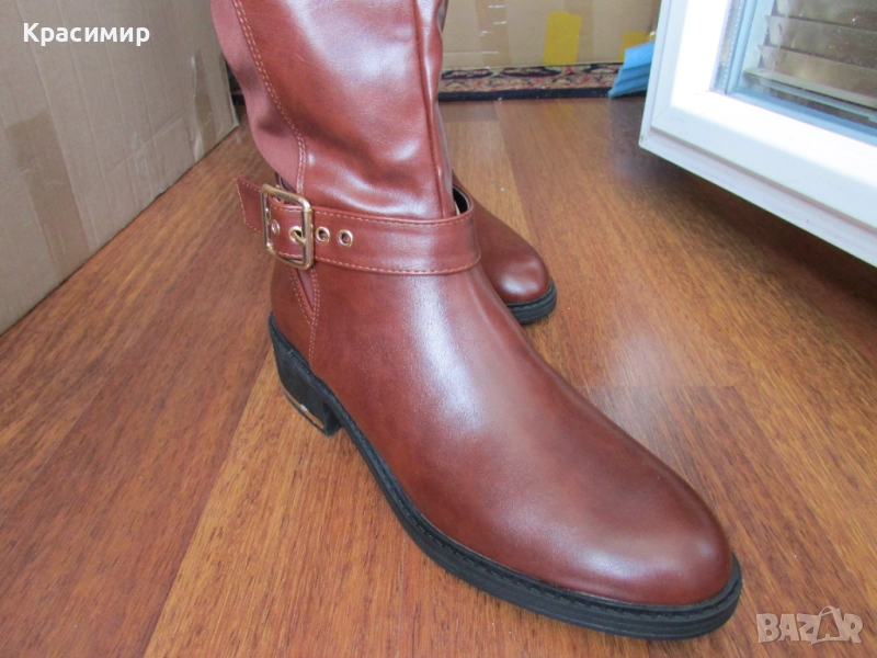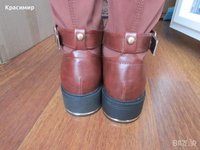 28: Дамски високи ботуши на английската реномирана марка - Dorothy Perkins. Предната половина е от кожа в кафяв цвят, а задната е от текстил. С каишка над глезена с жълта катарама и жълта лайсна на тока за ефект. Височината им е 43 см, а на тока 4 см. Подходящи са за по- широк крак отгоре - прасец, като обиколката е 40 см. Номер 39 по етикет, но отговарят на 38,5, с дължина на стелката 24,5 см.