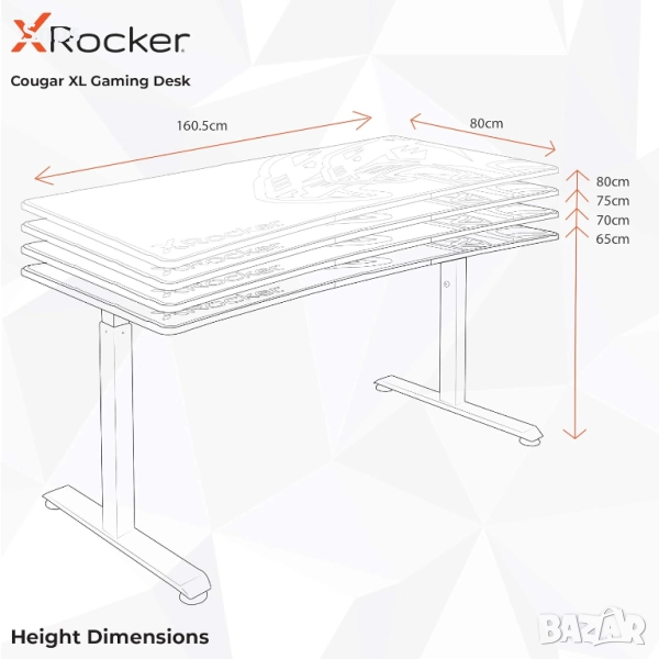 X Rocker Cougar XL е идеалното решение за бюро за всички геймъри! Височината на плота може да се регулира на стъпки от 5 см от 65 см до 80 см с едно щракване, което го прави подходящ за потребители от всички възрасти. Благодарение на общата ширина от 160,5 см, на бюрото се побират до три монитора с диагонал на екрана 27". Визуално Cougar XL впечатлява със стилния си дизайн, допълнен от тъмносивото карбоново покритие на плота.