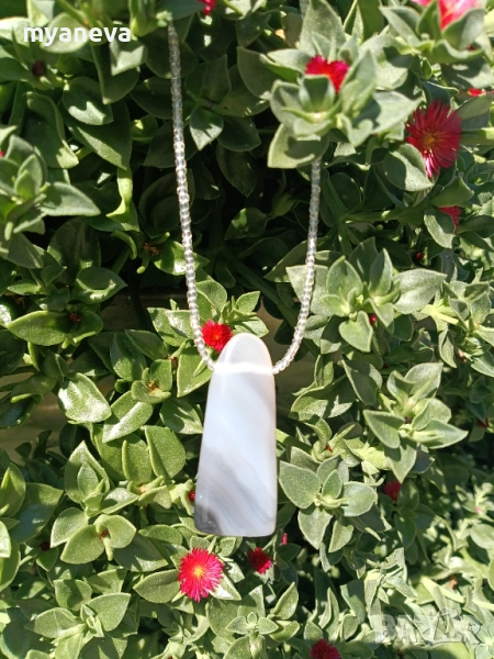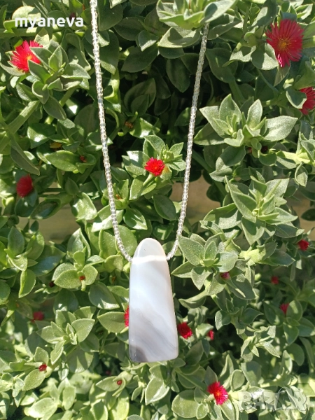 Елегантно колие с висулка от естествен камък . Изработено е от миниатюрни мъниста и е украсено с висулка от естествен сив ахат които се отличава със своите уникални ивици и преливащи нюанси създаващи усещане за спокойствие и хармония . Цена 40 лв .